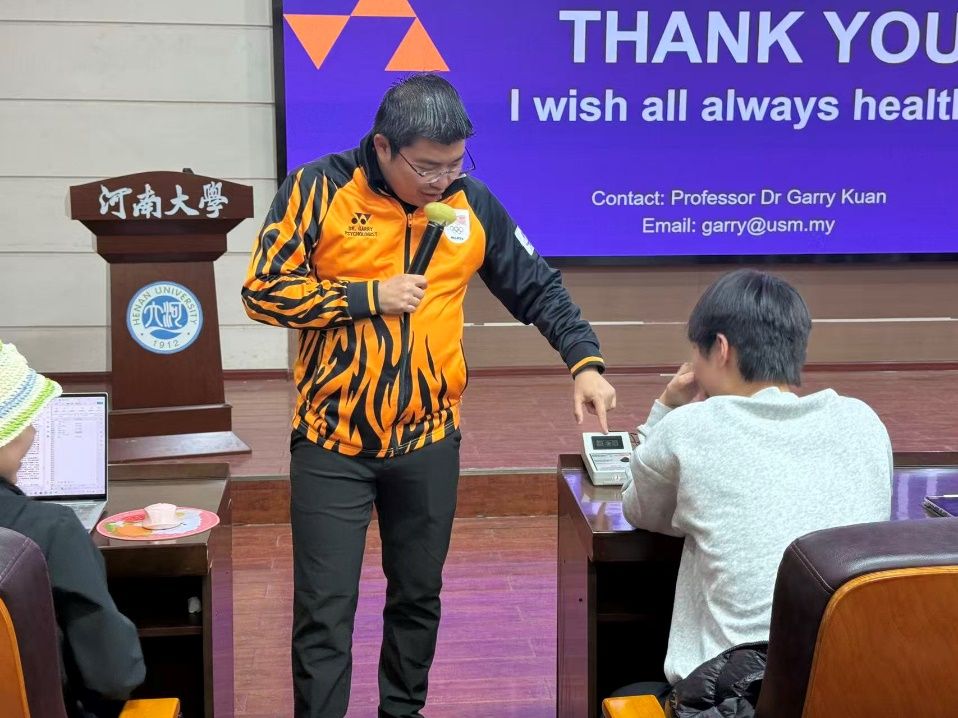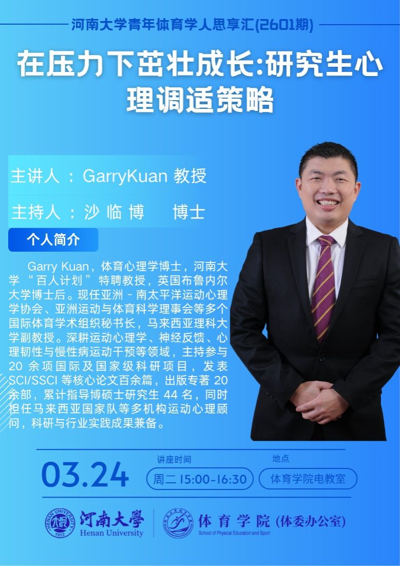 3月24日,河南大学青年体育学人“思享汇”2026年第一期由Garry Kuan(中文名关沛恩)教授主讲,他以“在压力下茁壮成长:研究生心理调适策略”为题,为体育学院师生带来精彩报告。体育学院部分青年教师、博士后和研究生参与了本次活动,报告由体育学院沙临博博士主持。